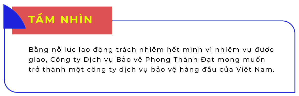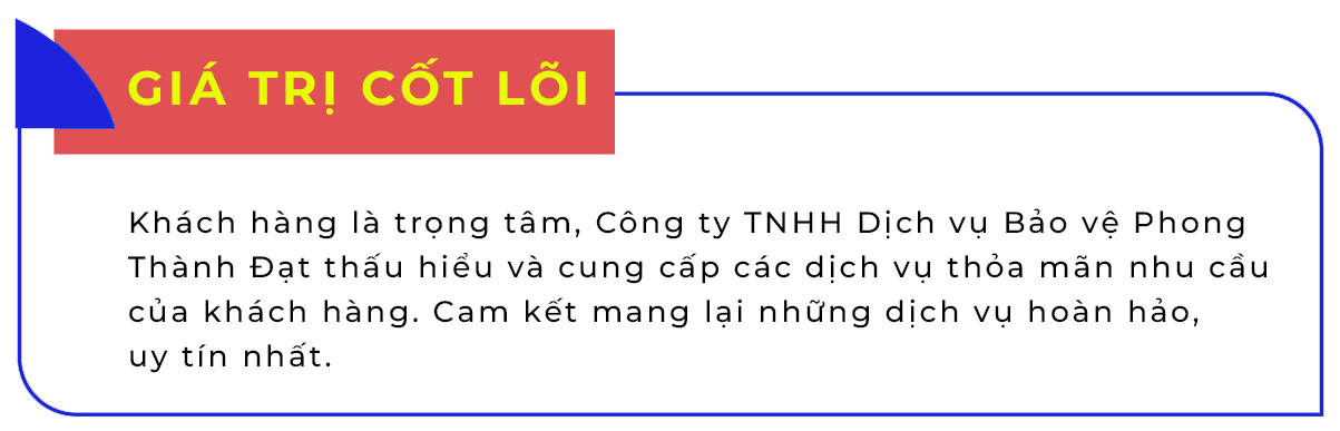 Với những giá trị căn bản đã đạt được cùng với sự đồng hành, hợp tác chặt chẽ của các quý khách hàng, Phong Thành Đạt luôn tin tưởng sẽ thực hiện thành công sứ mệnh của mình, trở thành công ty hàng đầu chuyên cung cấp dịch vụ bảo vệ và vệ sĩ chuyên nghiệp.